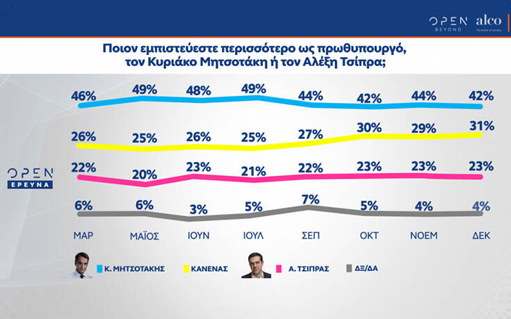 Επίσης, στη δημοσκόπηση του OPEN αποτυπώθηκε η διαφορά της Νέας Δημοκρατίας από τον ΣΥΡΙΖΑ, η οποία φτάνει στις 15,4 μονάδες. Παραμένει πρώτος στην εμπιστοσύνη των πολιτών ο Κυριάκος Μητσοτάκης, σε σχέση με τον Αλέξη Τσίπρα.