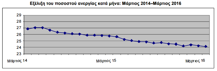 Αναλυτικά σύμφωνα με τα στοιχεία που ανακοίνωσε η ΕΛΣΤΑΤ, το εποχικά διορθωμένο ποσοστό ανεργίας τον Μάρτιο του 2016 ανήλθε σε 24,1% έναντι 25,7% τον Μάρτιο του 2015 και έναντι 24,2% τον Φεβρουάριο του 2016. Το σύνολο των απασχολουμένων, κατά τον Μάρτιο του 2016, εκτιμάται ότι ανήλθε σε 3.623.234 άτομα. Οι άνεργοι ανήλθαν σε 1.153.232 άτομα ενώ ο οικονομικά µη ενεργός πληθυσμός ανήλθε σε 3.281.503 άτομα.
