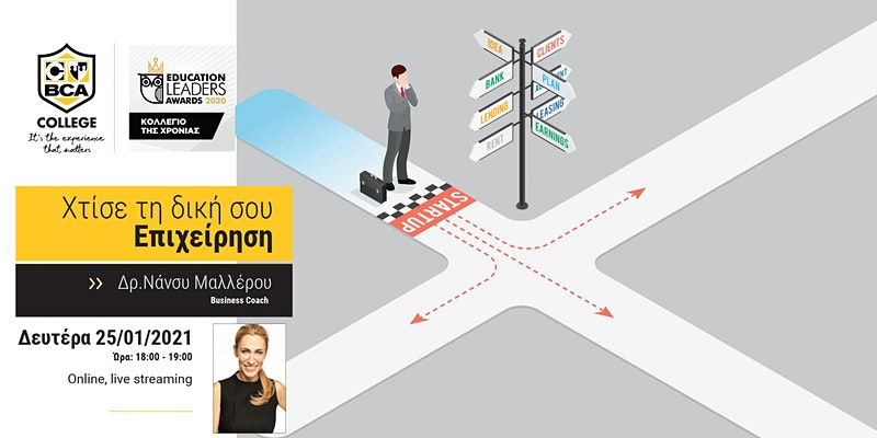 Αυτό είναι το θέμα της διαδικτυακής εκδήλωσης που διοργανώνει το BCA με τη Δρ. Νάνσυ Μαλλέρου τη Δευτέρα 25/01/2021 στις 18:00. Το εξειδικευμένο σε επιχειρησιακές σπουδές κολλέγιο, που προάγει εδώ και 50 χρόνια την επιχειρηματικότητα, κάλεσε τη πολυβραβευμένη Bussiness Coach για να βοηθήσει νέους αλλά και ανθρώπους κάθε ηλικίας που σκέφτονται να ξεκινήσουν ή να μεγαλώσουν μια επιχείρηση να πλεύσουν με ασφάλεια στα νερά της επιχειρηματικότητας, βασισμένοι σε αξιόπιστα εργαλεία και στρατηγικές. Μετά την ομιλία θα επακολουθήσει συζήτηση με την εισηγήτρια.