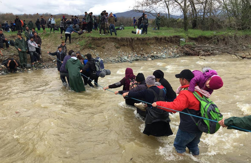 Περίπου 500 πρόσφυγες, αψηφώντας τον κίνδυνο να παρασυρθούν από τα ορμητικά νερά και κρατώντας ένα σχοινί, ο ένας πίσω από τον άλλο, ξεκίνησαν από την Ειδομένη του Κιλκίς με σκοπό να φτάσουν στα Σκόπια.