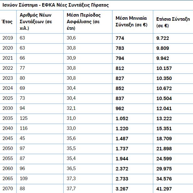 Όπως αναφέρει στα συμπεράσματα η Εθνική Αναλογιστική Αρχή «η μέση μηνιαία κύρια σύνταξη, στη μεταρρύθμιση (reform scenario), αυξάνεται σταδιακά, εξαιτίας της αύξησης των ετησίων συντελεστών αναπλήρωσης από τα 30 έτη ασφάλισης και άνω, καθώς και τη σταδιακή αύξηση των ετών ασφάλισης. Η μέση ετήσια κύρια σύνταξη επηρεάζεται από την αντικατάσταση του άρθρου 120 του Ν.4611/2019 (σ.σ. το άρθρο που καθιέρωσε την 13η σύνταξη) και την εισαγωγή του μηχανισμού 0,5% του ΑΕΠ, μέσω του οποίου χρηματοδοτούνται κοινωνικές παροχές».