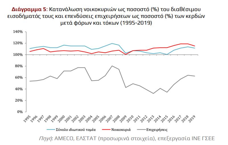 - η δαπάνη των νοικοκυριών ήταν το κύριο μακροοικονομικό μέγεθος που σταθεροποίησε τον πραγματικό τομέα της οικονομίας τα τελευταία χρόνια. Αντιθέτως, οι επενδύσεις των επιχειρήσεων κυμάνθηκαν σε ιστορικά χαμηλά επίπεδα καθιστώντας τον μακροοικονομικό ρόλο του συγκεκριμένου τομέα αποσταθεροποιητικό. Ενώ λοιπόν από την πλευρά των νοικοκυριών, η καταναλωτική δαπάνη, και συνεπώς η εγχώρια ζήτηση, διατηρήθηκε σε υψηλό επίπεδο μέσα από τη χρήση ιδίων πόρων, δεν ισχύει το ίδιο για την επενδυτική δραστηριότητα των επιχειρήσεων. Επιπλέον, το είδος των επενδύσεων που υλοποιούνται δεν συμβάλλει στη βελτίωση των παραγωγικών δυνατοτήτων της οικονομίας.