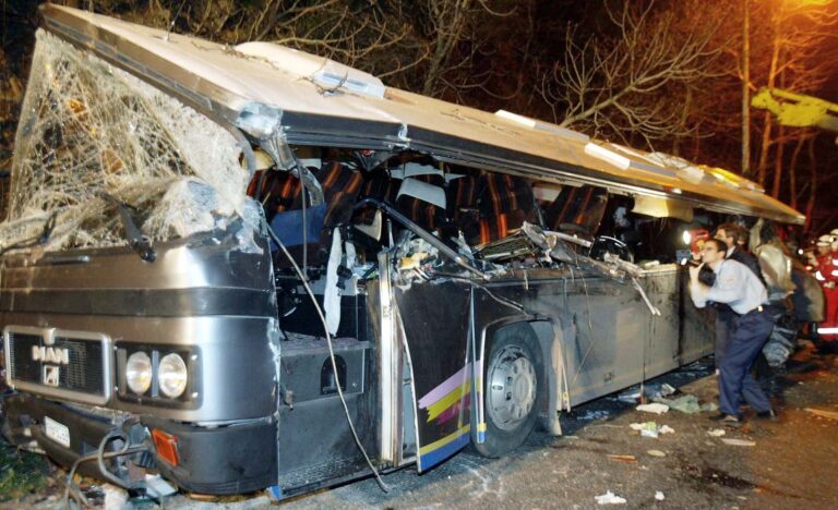Η σύγκρουση είναι σφοδρή που το όχημα διαλύθηκε σε χιλιάδες κομμάτια. Οι λαμαρίνες εκτοξεύθηκαν στη δεξιά λωρίδα και στα πρανή του δρόμου. Επτά Έλληνες φίλαθλοι έχασαν ακαριαία τη ζωή τους. Οι υπόλοιποι τρεις είναι τραυματίες και μεταφέρονται στο κοντινότερο νοσοκομείο με τον έναν από αυτούς βρίσκεται σε κρίσιμη κατάσταση.