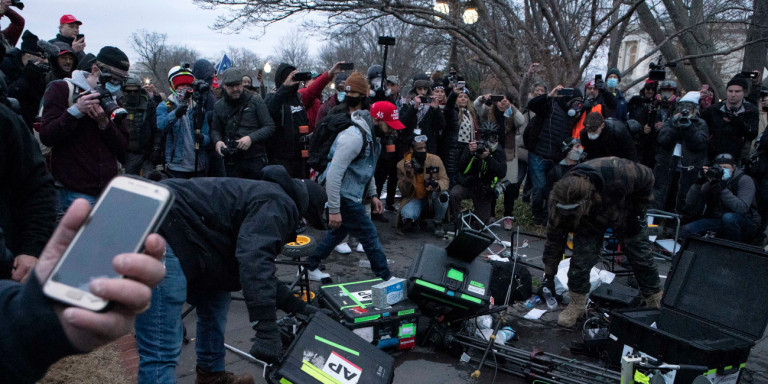 Trump loyalists attacking media and destroying their equipment. U.S. President Trump labeled journalists & news media, ‘the enemy of the people’ earlier. (?@Julio_Rosas11) #DCProtests #Capitol pic.twitter.com/uIV4zT7fbt