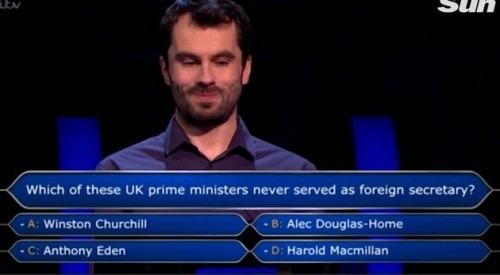 Ένας δάσκαλος από το Μπέρμιγχαμ παραλίγο να κερδίσει το αστρονομικό ποσό του 1 εκατομμυρίου στο γνωστό παιχνίδι «Ποιος Θέλει να Γίνει Εκατομμυριούχος», όταν όμως απέτυχε να απαντήσει στην ερώτηση «Ποιός πρώην πρωθυπουργός δεν έχει υπηρετήσει ποτέ ως υπουργός Εξωτερικών», τα έχασε μέσα από τα χέρια του. Ο φίλος του όμως ήξερε την απάντηση!