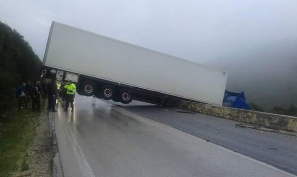 Λαχτάρησε ο οδηγός νταλίκας που έχασε τον έλεγχο λόγω πυκνής ομίχλης, όταν το όχημα έσπασε το προστατευτικό τοιχίο και βρέθηκε να κρέμεται με τον τράκτορα σε γκρεμό στην εθνική οδό Ιωαννίνων – Αθηνών.
