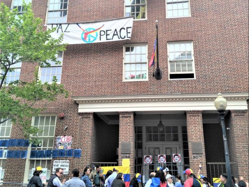 Από τα μέσα Απριλίου, μέλη τριών ομάδων ακτιβιστών πραγματοποιούν “κατάληψη” στην πρεσβεία, ένα κτίριο από κόκκινα τούβλα στη συνοικία Τζορτζτάουν. Οι ακτιβιστές υποστηρίζουν ότι είναι “προσκεκλημένοι” της κυβέρνησης της Βενεζουέλας και διαμαρτύρονται για την επέμβαση των ΗΠΑ στη χώρα αυτή με σκοπό την ανατροπή του Νικολάς Μαδούρο. Οι ΗΠΑ αναγνωρίζουν ως νόμιμο, μεταβατικό πρόεδρο της Βενεζουέλας τον Χουάν Γκουαϊδό.
