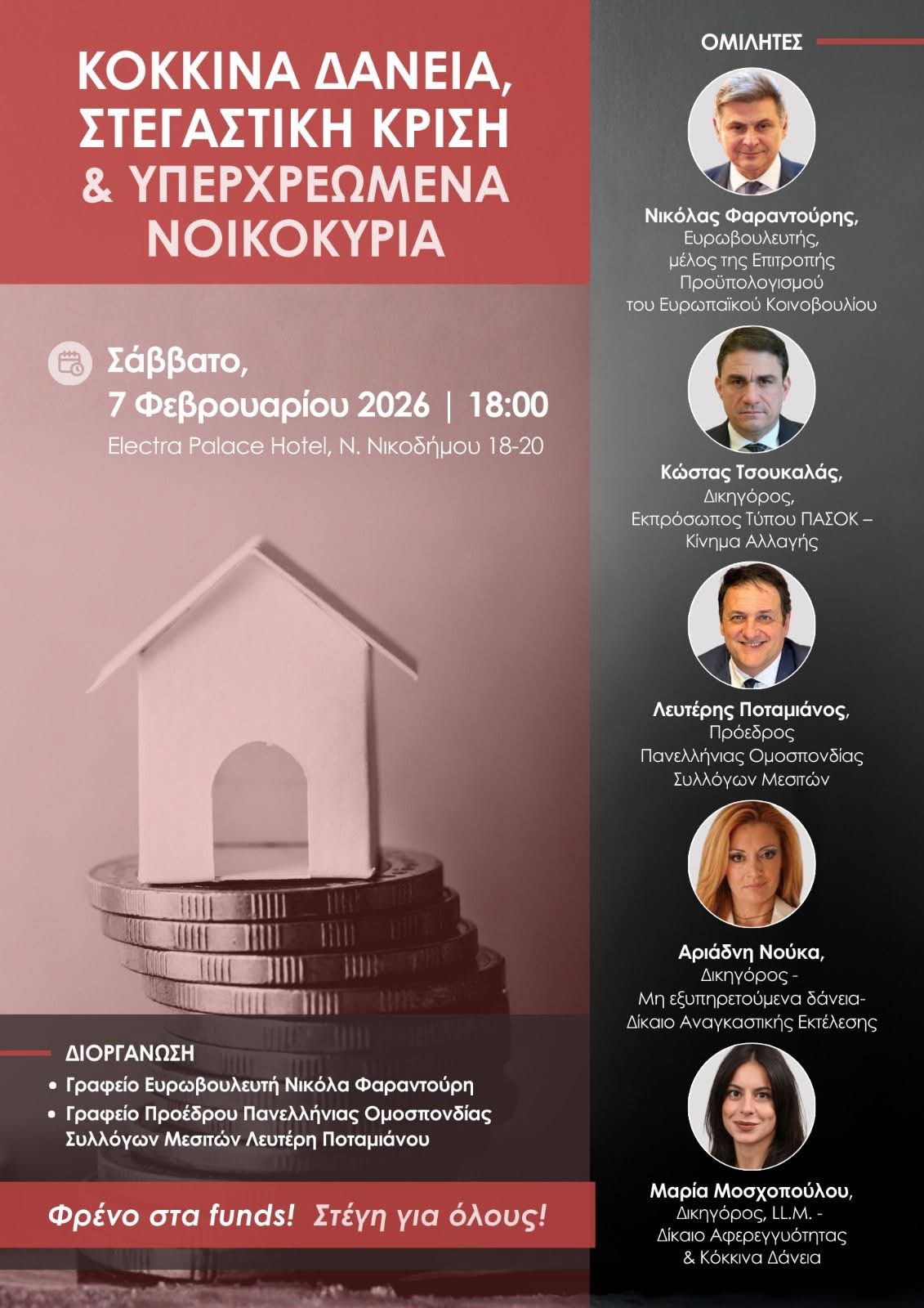 Σε κεντρικό σύνθημα «Φρένο στα funds – Στέγη για όλους» πραγματοποιείται σήμερα Σάββατο 7 Φεβρουαρίου στις 18:00 στο ξενοδοχείο Electra Palace στην Αθήνα η μεγάλη εκδήλωση που συνδιοργανώνουν ο ευρωβουλευτής Νικόλας Φαραντούρης μαζί με την Πανελλήνια Ομοσπονδία Μεσιτών.