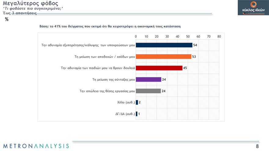 Η συντριπτική πλειοψηφία θεωρεί ότι η προσωπική οικονομική κατάσταση θα είναι σταθερή ή χειρότερη μέχρι το τέλος της πανδημίας. Μεγαλύτεροι φόβοι είναι η αδυναμία εξυπηρέτησης των υποχρεώσεων, η μείωση των αποδοχών και η ανεργία των νέων.
