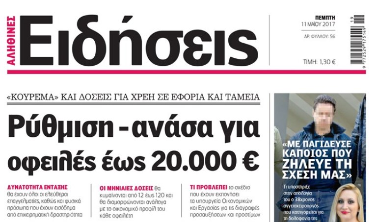 Με τίτλο: “Ρύθμιση-ανάσα για οφειλές έως 20.000€“, κυκλοφορεί σήμερα η καθημερινή εφημερίδα «Ειδήσεις».
