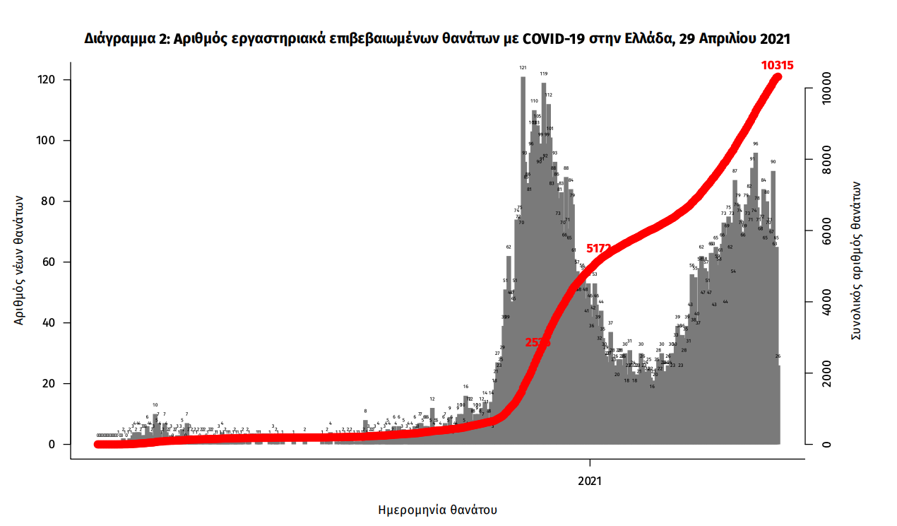Οι νέοι θάνατοι ασθενών με COVID-19 είναι 73, ενώ από την έναρξη της επιδημίας έχουν καταγραφεί συνολικά 10.315 θάνατοι. Το 95.4% είχε υποκείμενο νόσημα ή/και ηλικία 70 ετών και άνω.