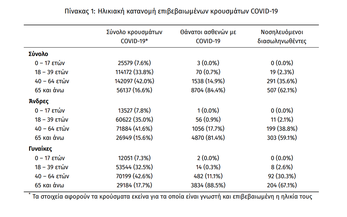 Ο αριθμός των ασθενών που νοσηλεύονται διασωληνωμένοι είναι 817 (62.9% άνδρες). Η διάμεση ηλικία τους είναι 68 έτη. To 85.6% έχει υποκείμενο νόσημα ή/και ηλικία 70 ετών και άνω. Από την αρχή της πανδημίας έχουν εξέλθει από τις ΜΕΘ 2.104 ασθενείς. Οι εισαγωγές2 νέων ασθενών Covid-19 στα νοσοκομεία της επικράτειας είναι 484 (ημερήσια μεταβολή -8.68%). Ο μέσος όρος εισαγωγών του επταημέρου είναι 463 ασθενείς.Η διάμεση ηλικία των κρουσμάτων είναι 44 έτη (εύρος 0.2 έως 106 έτη), ενώ η διάμεση ηλικία των θανόντων είναι 78 έτη (εύρος 0.2 έως 106 έτη).