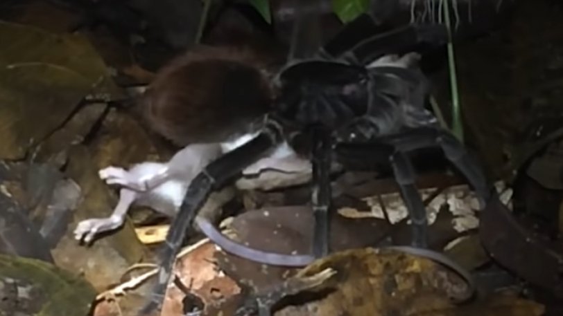 Στα πλάνα εμφανίζεται η τεράστια ταραντούλα -που ως γνωστόν συγκαταλέγεται μεταξύ των σαρκοβόρων- να έχει παγιδεύσει με τα πόδια της το μικρό θηλαστικό, ενώ στη συνέχεια το σέρνει κάτω από ένα δέντρο, αρχίζοντας να το κατασπαράζει.