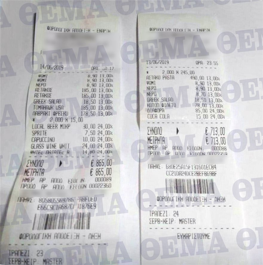 Όπως θα δείτε και στις αποδείξεις, ένας καφές καπουτσίνο κοστίζει 10 ευρώ, και ένα ποτήρι λευκό κρασί 24 ευρώ. Στην δεύτερη απόδειξη, με ημερομηνία 13/6, φαίνεται πως μια αστακομακαρονάδα χρεώθηκε 490 ευρώ κι ένα αναψυκτικό 15 ευρώ, ενώ δεν περνά απαρατήρητο και το πανάκριβο ΝΕΡΟ που χρεώνεται 8,90 ευρώ.
