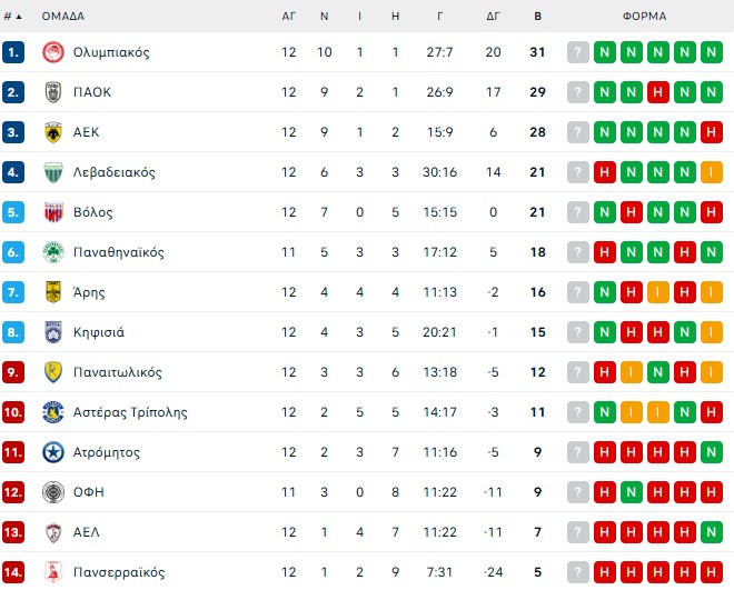 Η βαθμολογία της Super League μετά το αθηναϊκό ντέρμπι και τις νίκες Ολυμπιακού, ΠΑΟΚ