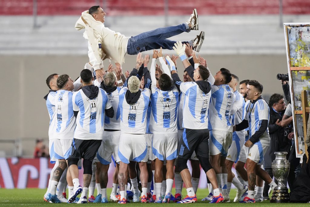 Ο Άνχελ Ντι Μαρία, που έχει ανακοινώσει την απόσυρσή του από την Εθνική, αποθεώθηκε από τους συμπαίκτες του, οι οποίοι τον σήκωσαν στα χέρια.