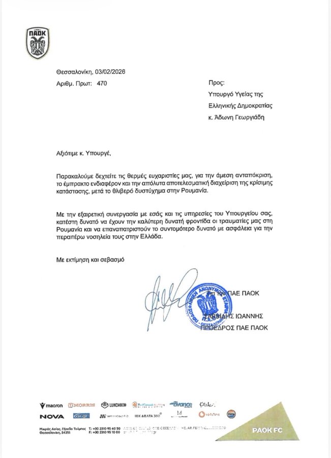 Η ΠΑΕ ΠΑΟΚ, με πρωτοβουλία του προέδρου της Ιβάν Σαββίδη, εξέφρασε την ευγνωμοσύνη της προς το Υπουργείο Υγείας και τον υπουργό Άδωνι Γεωργιάδη, με επίσημη επιστολή. Η κίνηση αυτή αποτελεί αναγνώριση της καθοριστικής συμβολής τους στη διαχείριση της κρίσης που ακολούθησε το τραγικό δυστύχημα στη Ρουμανία.
