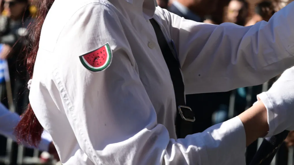 Στη φετινή μαθητική παρέλαση της 28ης Οκτωβρίου στην Αθήνα, μία μαθήτρια τράβηξε τα βλέμματα, επιλέγοντας να κολλήσει στο μανίκι του πουκαμίσου της ένα αυτοκόλλητο καρπουζιού, αναφορά στην Παλαιστίνη.