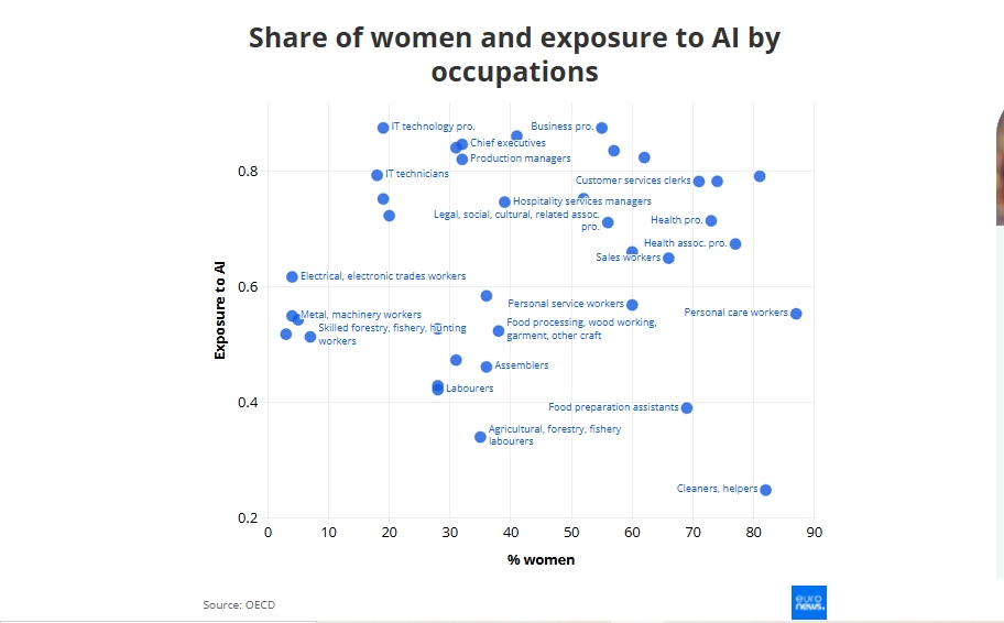 Οι θέσεις με τη μεγαλύτερη έκθεση στην ΤΝ είναι εκείνες που αναμένεται να επηρεαστούν περισσότερο και να υποστούν τις μεγαλύτερες αλλαγές. Σύμφωνα με τον ΟΟΣΑ, άνδρες και γυναίκες εκτίθενται περίπου στο ίδιο επίπεδο συνολικά, όμως οι γυναίκες υποεκπροσωπούνται στα επαγγέλματα με την υψηλότερη έκθεση, όπως οι επιστήμονες, οι μηχανικοί και τα ανώτατα στελέχη. Για παράδειγμα, 82% των καθαριστών και βοηθών είναι γυναίκες, και αυτό το επάγγελμα έχει την χαμηλότερη έκθεση στην ΤΝ (0,25 σε κλίμακα 1). Αντίθετα, μόνο το 19% των επαγγελματιών της πληροφορικής είναι γυναίκες, και αυτό το επάγγελμα έχει την υψηλότερη έκθεση (0,88).