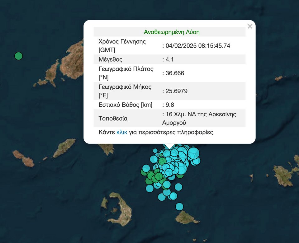 - Στις 10:15 σημειώθηκε σεισμός 4,1 Ρίχτερ σε απόσταση 16 χλμ. ΝΔ της Αρκεσίνης Αμοργού.