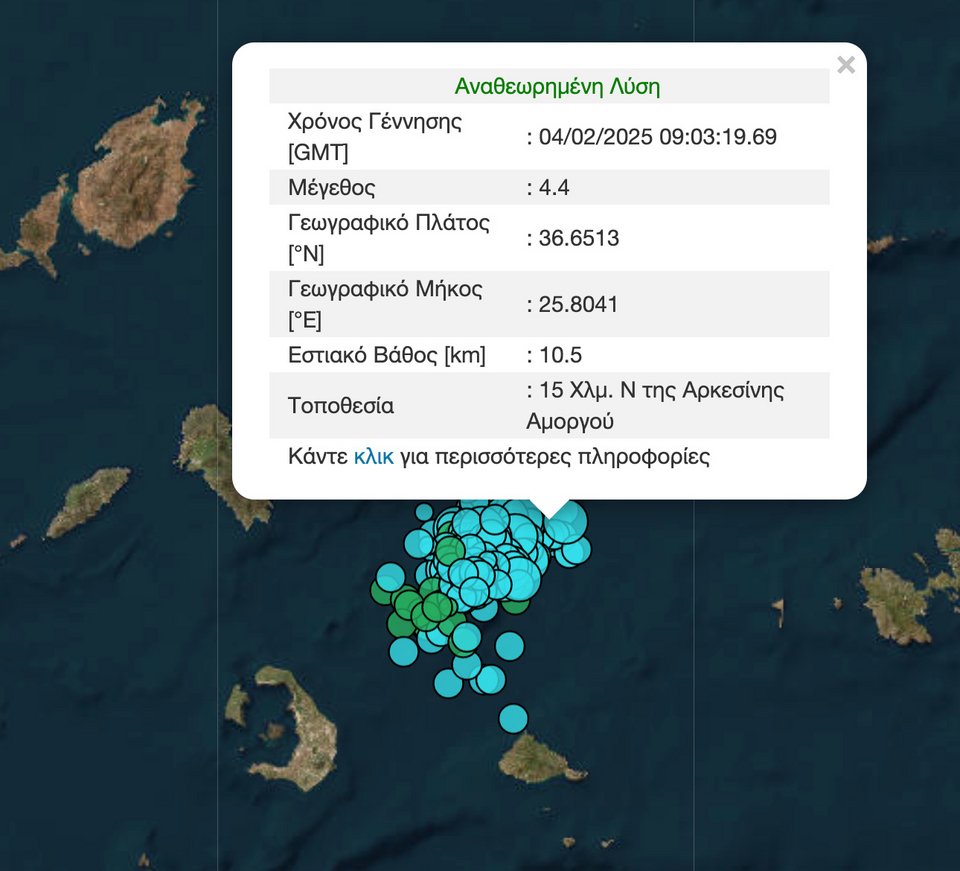 - Στις 11:03 σημειώθηκε σεισμός 4,4 Ρίχτερ σε απόσταση 15 χλμ. Ν της Αρκεσίνης Αμοργού.