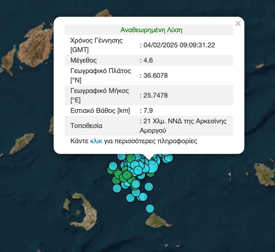Συγκεκριμένα, στις 11:09 σημειώθηκε σεισμός 4,6 Ρίχτερ σε απόσταση 21 χλμ. ΝΔΔ της Αρκεσίνης Αμοργού.