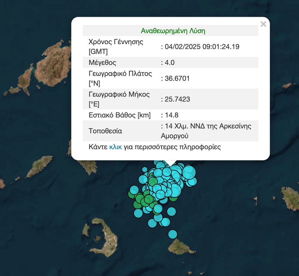 - Στις 11:01 σημειώθηκε σεισμός 4 Ρίχτερ σε απόσταση 14 χλμ. ΝΝΔ της Αρκεσίνης Αμοργού.
