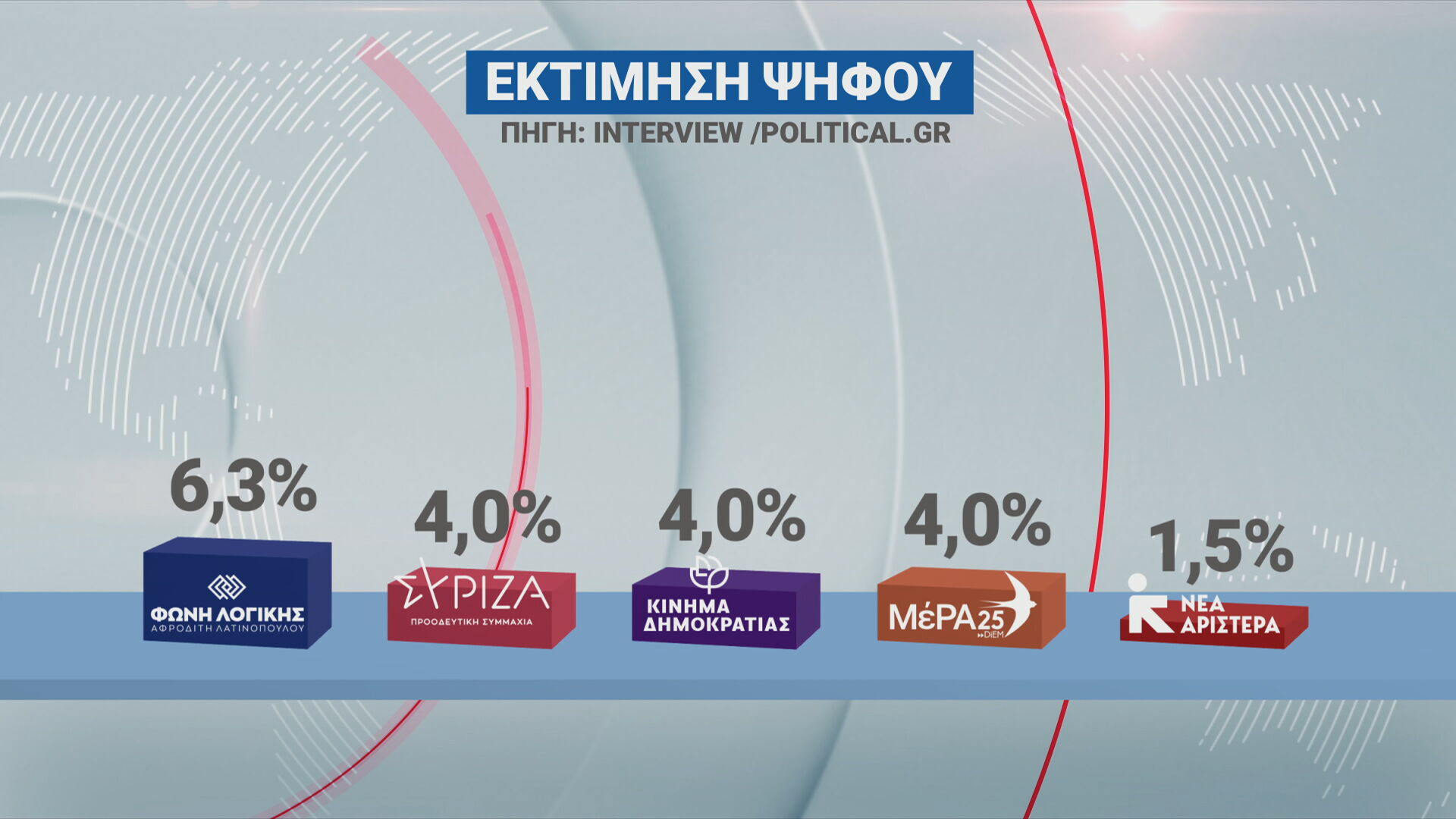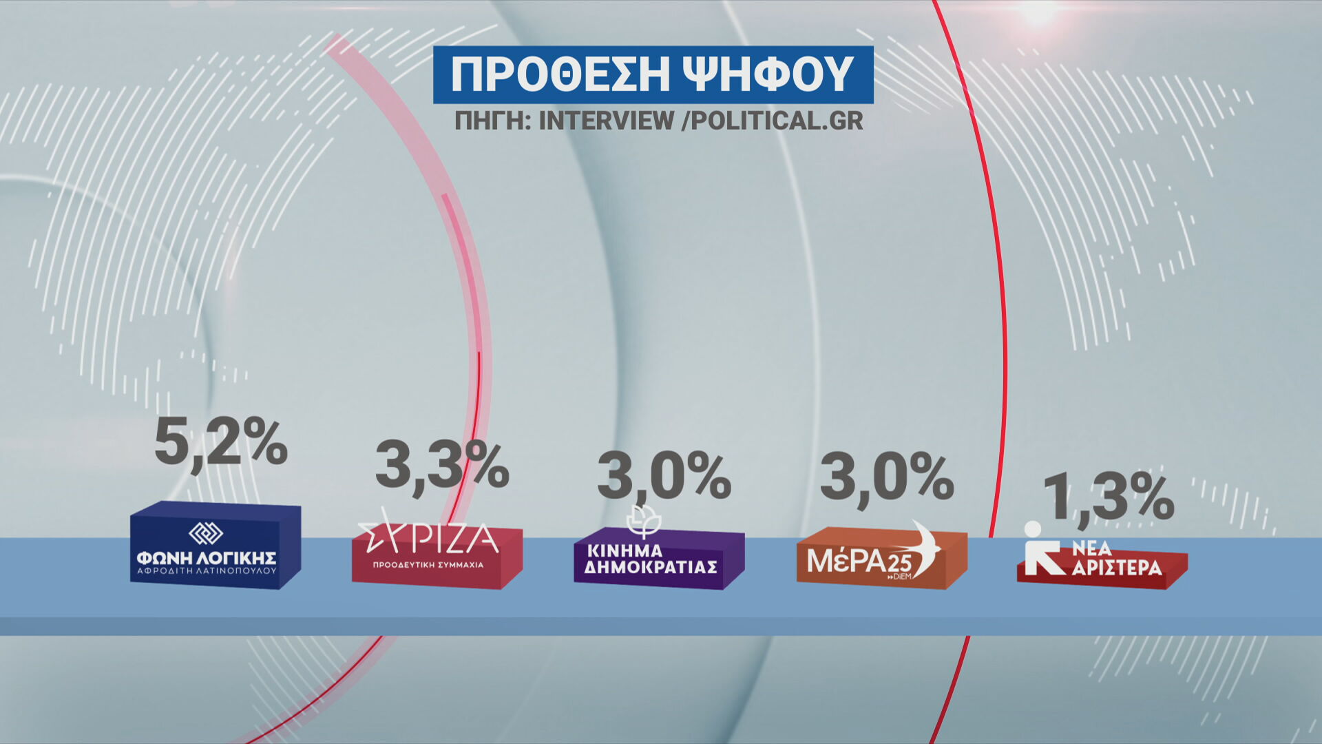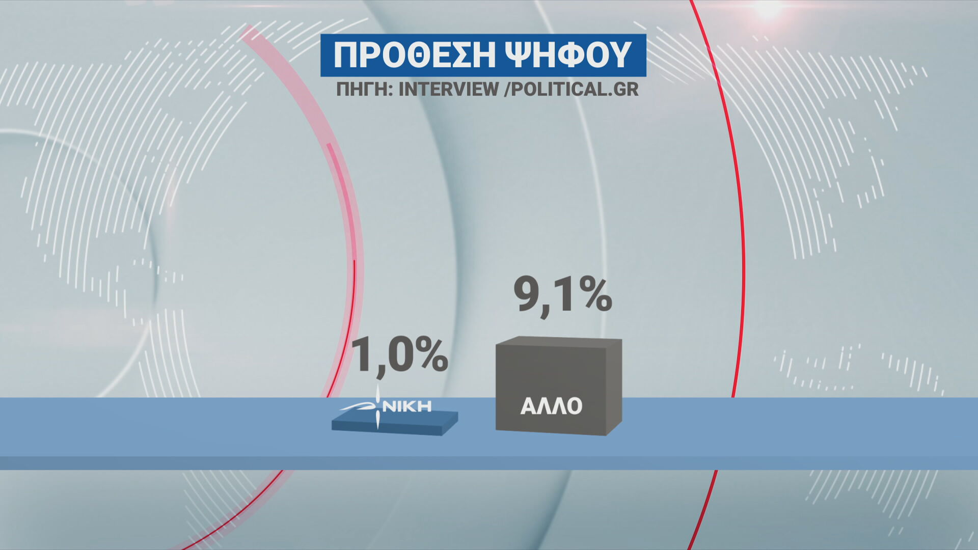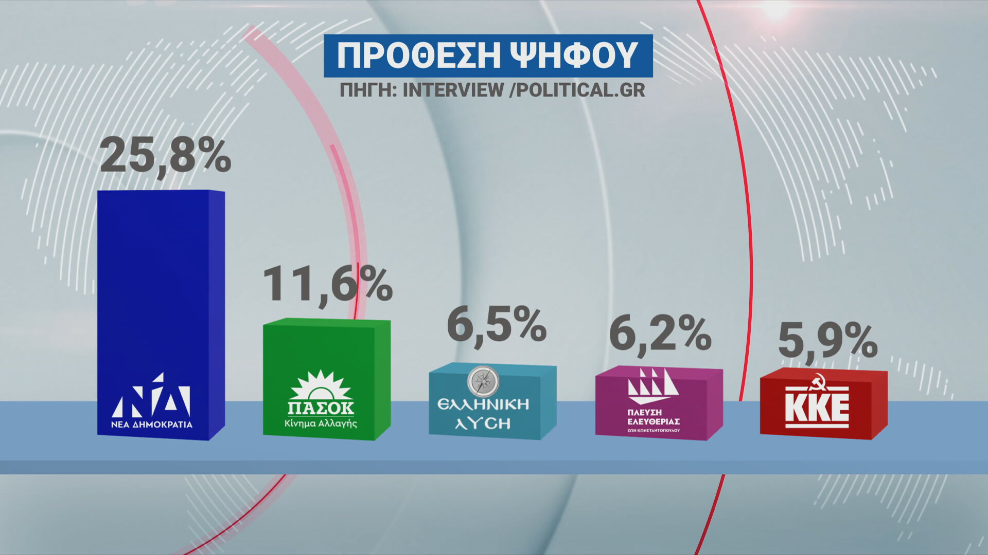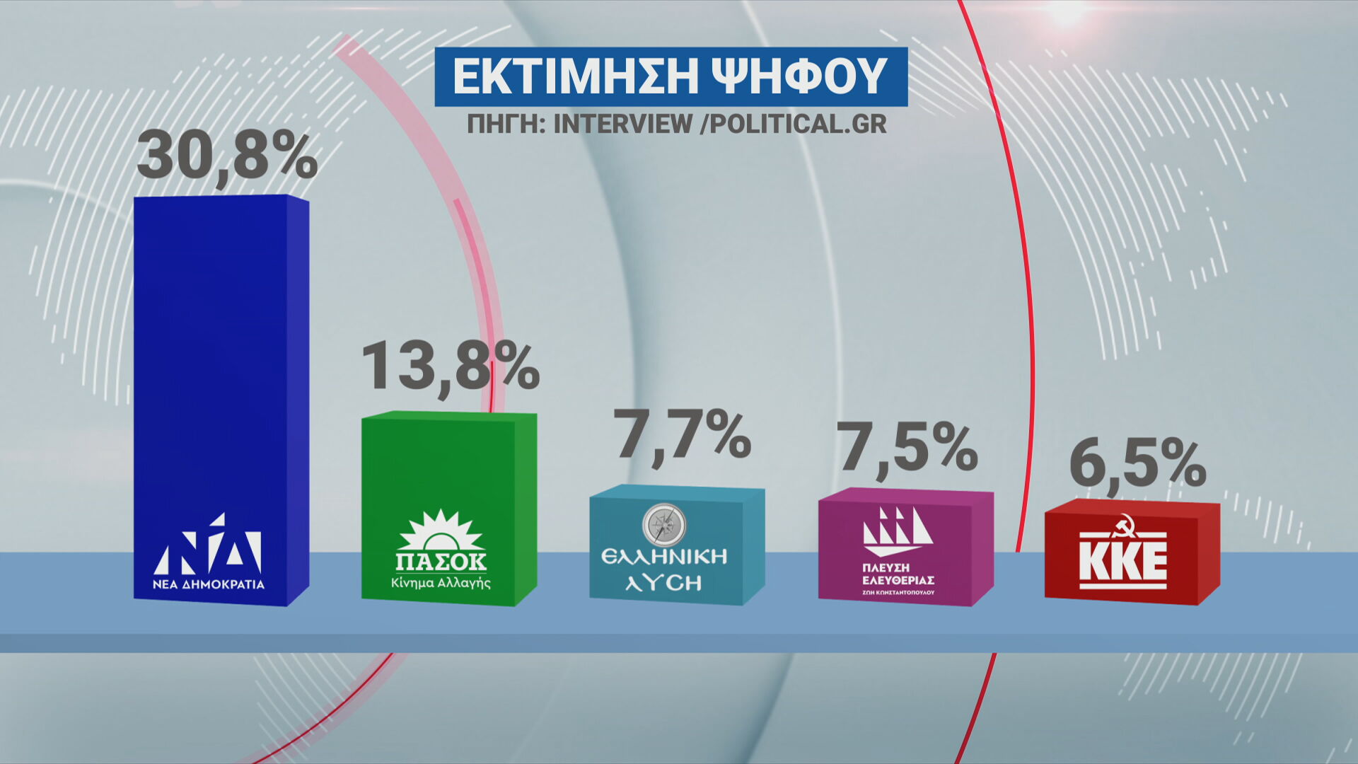 Δημοσκόπηση Interview: Προβάδισμα 13 μονάδων στη Νέα Δημοκρατία