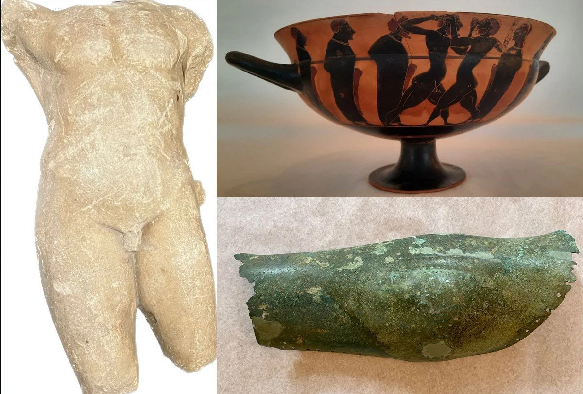 Τα αρχαία αντικείμενα που επιστρέφουν πίσω στην χώρα που… γεννήθηκαν είναι ειδώλια, πήλινα και χάλκινα αγγεία, ένα χρυσό διάδημα με φύλλα δάφνης, ένα κορμό γυμνής ανδρικής νεαρής μορφής, ένα χάλκινο αγαλματίδιο γυμνού αθλητή, ένα ζεύγος χάλκινων περικνημίδων και ένα αργυρό νόμισμα (στατήρας).