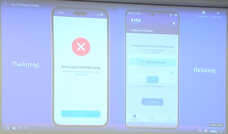 - Τέλος το τρίτο εργαλείο είναι η ψηφιακή επαλήθευση ηλικίας. Όποιος θέλει να αγοράσει αλκοόλ ή καπνό θα πρέπει να δείχνει την νέα ταυτότητα και θα υπάρχει ενημέρωση στο Gov.gr wallet για να υπάρχει η επιλογή έλεγχος ηλικίας. Ο πωλητής δεν θα χρειάζεται να συνδεθεί. Βγαίνει ένα QR Code και αν κάποιος είναι ανήλικος θα βγαίνει ένα κόκκινο σήμα που θα δείχνει ότι ο υποψήφιος αγοραστής είναι κάτω των 18.