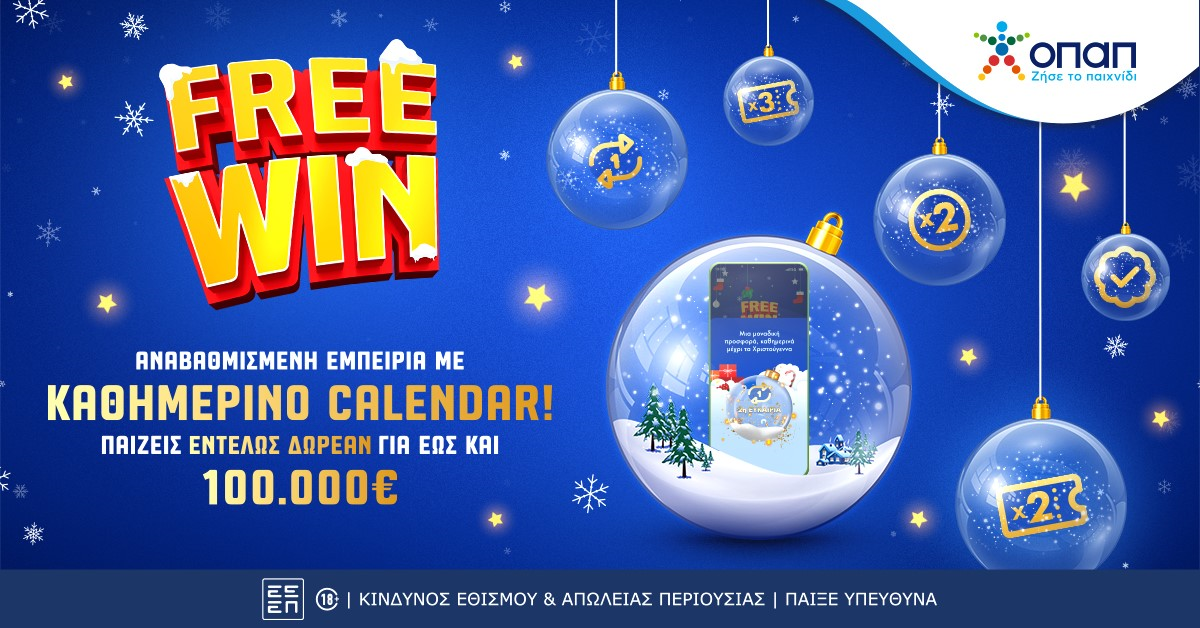 Γιορτές με FREEWIN στα καταστήματα ΟΠΑΠ – Μέχρι 100.000 ευρώ εντελώς δωρεάν κάθε μέρα και εορταστικό ημερολόγιο με δώρα