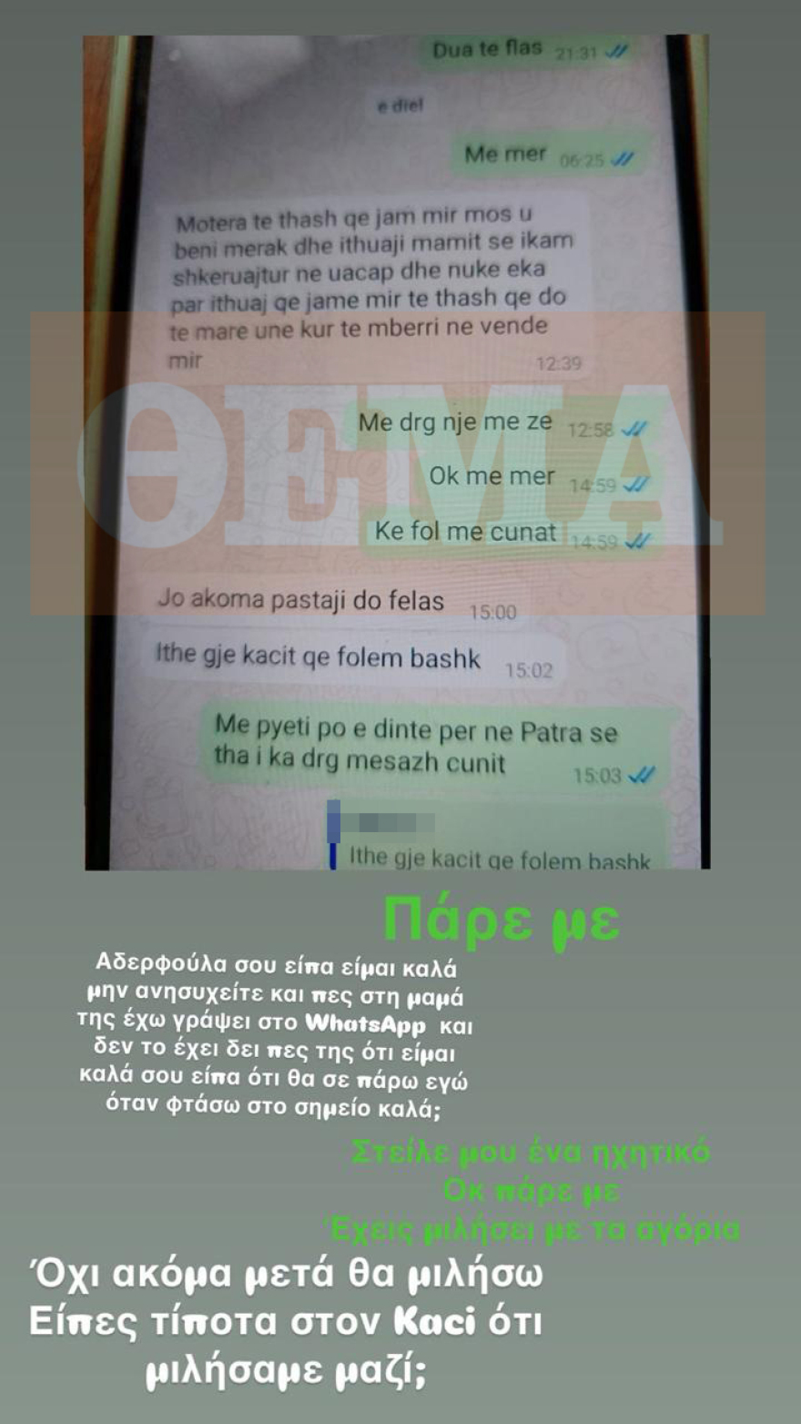 Η αδερφή της γυναίκας συνέχισε να ζητά απαντήσεις για το πού βρίσκεται. «Τώρα είμαι στην Πάτρα. Μετά θα φύγω για Ιταλία με έναν φίλο μου. Όταν φτάσουμε, θα σε πάρω εγώ. Είμαι καλά, μην ανησυχείτε. Μην πείτε τίποτα στον … ότι φεύγω για Ιταλία. Δεν έχω πει τίποτα για αυτό το ταξίδι», ήταν η απάντηση που έλαβε, ρωτώντας γιατί.