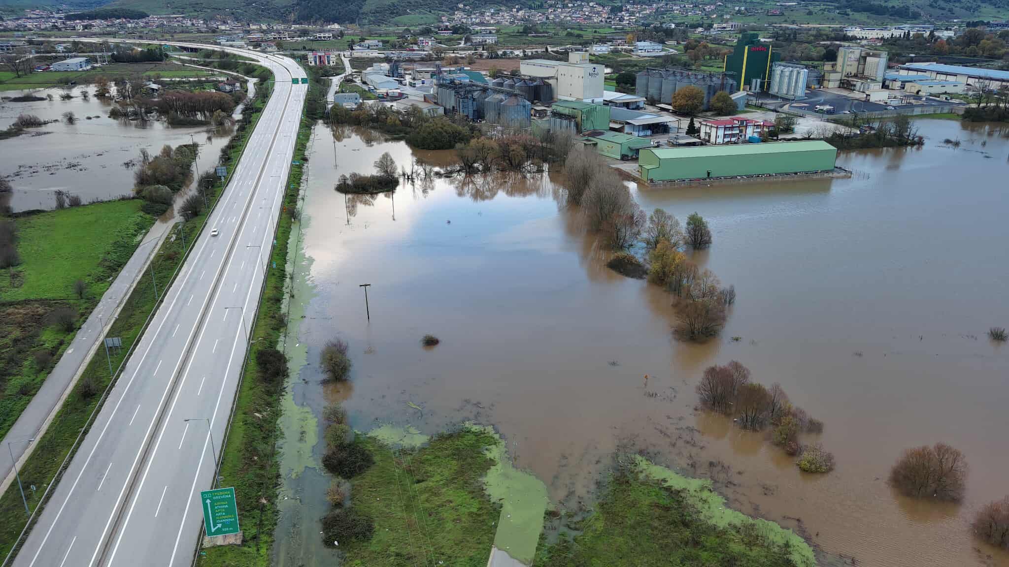Η κακοκαιρία που έπληξε την Ήπειρο, μετατέτρεψε σε λίμνη μεγάλη έκταση γης κοντά σε βιομηχανίες αλλά και στην Εγνατία Οδό, στην περιοχή Πεδινή. Αν η στάθμη ανέβει περισσότερο είναι υπαρκτός ο κίνδυνος το νερό να εισβάλλει μέσα στον αυτοκινητόδρομο. Μέχρι στιγμής, οριακή είναι στάθμη και για τα εργοστάσια και αποθήκες που υπάρχουν στην ευρύτερη περιοχή.