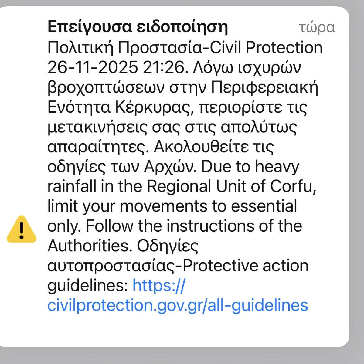 Σε ποτάμια έχουν μετατραπεί αρκετοί δρόμοι της Κέρκυρας εξαιτίας της έντονης βροχόπτωσης. Σοβαρά προβλήματα έχουν προκληθεί στις περιοχές Ποταμός, Αη Γιάννης, Κοκκίνι, Κοντόκαλι. Με δυσκολία διεξάγεται αυτή τη στιγμή η κυκλοφορία των οχημάτων στο εισερχόμενο ρεύμα της Εθνικής Παλαιοκαστρίτσας από το ύψος της Αγίας Αικατερίνης, ενώ κλειστή για τα οχήματα είναι η οδός Σπ. Περουλάκη. Στην περιοχή Κυρά Χρυσικου έπεσε δέντρο που έκλεισε το δρόμο, ενώ πλημμύρισαν μια φαρμακαποθήκη, φροντιστήριο στο Κοκκίνι, η περιοχή της Σπηλιάς καθώς και η διασταύρωση προς τον Άγιο Προκόπη. Λόγω της κακοκαιρίας δεν πραγματοποιήθηκε η συνεδρίαση του δημοτικού Συμβουλίου καθώς πλημμύρισε η αίθουσα. Έκκληση να περιορίσουν οι πολίτες τις μετακινήσεις κάνει η Πολιτική Προστασία με μήνυμα που εστάλη στα κινητά των κατοίκων της Κέρκυρας.