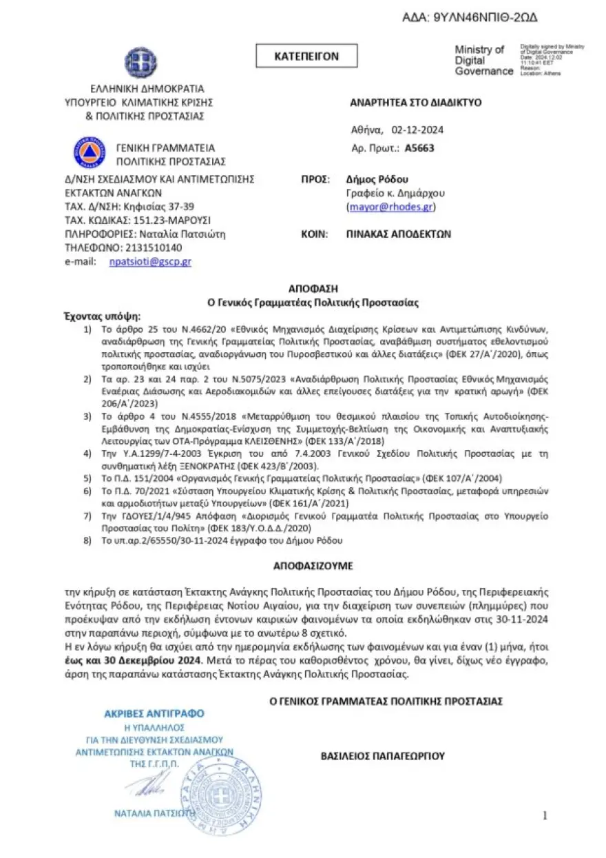 Σχετικά με τη Ρόδο, έπειτα από αίτημα του Δημάρχου, Αλέξανδρου Κολιάδη, ο Δήμος κηρύχθηκε και επισήμως σε κατάσταση έκτακτης ανάγκης το μεσημέρι της Δευτέρας, με απόφαση του Γενικού Γραμματέα Πολιτικής Προστασίας Βασίλειου Παπαγεωργίου. Υπενθυμίζεται ότι το Σάββατο το νησί της Ρόδου βίωσε το μεγαλύτερο πλημμυρικό φαινόμενο στην ιστορία της.