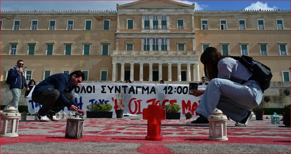 Με κόκκινη μπογιά έγραψαν ξανά τα ονόματα των θυμάτων της τραγωδίας των Τεμπών μπροστά στη Βουλή φοιτητές, κατά την άφιξη της πορείας μνήμης που πραγματοποιούν στην Αθήνα.