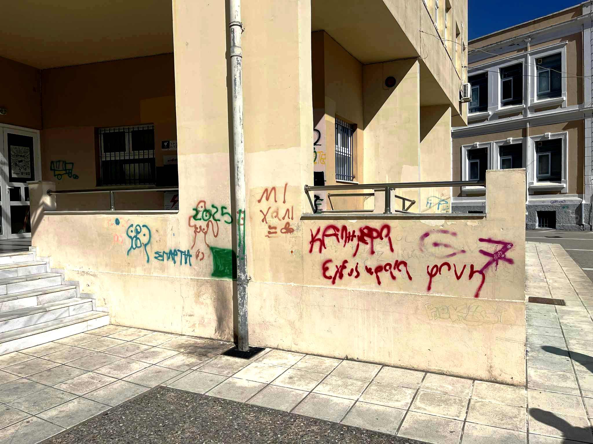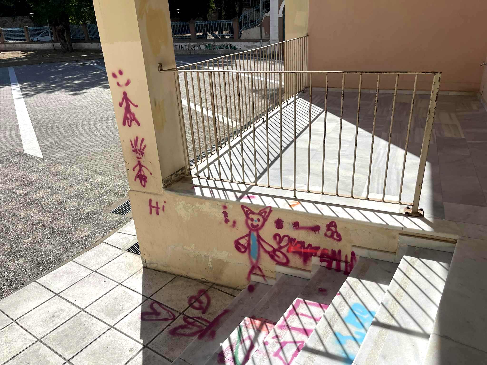 - Γκράφιτι με ρατσιστικά συνθήματα και σεξιστικά σύμβολα στους τοίχους και στις επιφάνειες του σχολείου.