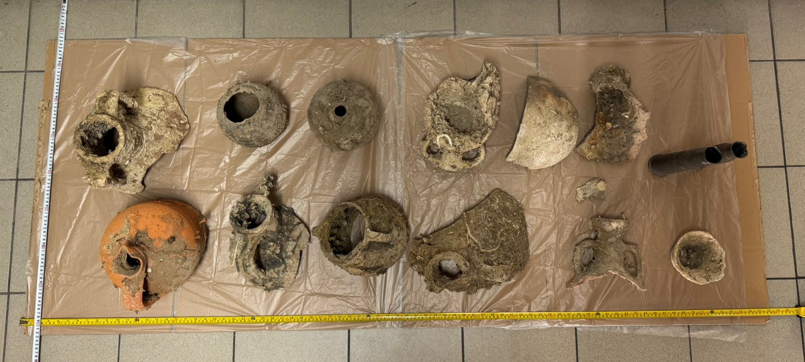 Η έρευνα στο κατάστημα έκρυβε πολλές εκπλήξεις: σε αποθήκη βρέθηκαν καλά κρυμμένα δύο βάσεις αμφορέων, τμήματα σωμάτων, τέσσερα στόμια με λαβές, τρεις υδρίες, ακόμη δύο αμφορείς, καθώς και διάφορα άλλα θραύσματα. Μαζί με αυτά, κατασχέθηκαν και δύο κάλυκες παλαιών πυροβόλων.