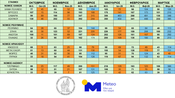 Τα αθροιστικά ύψη βροχής σε επιλεγμένους σταθμούς του meteo.gr/Εθνικού Αστεροσκοπείου Αθηνών και στα 4 Περιφερειακές Ενότητες της Κρήτης, για την περίοδο Οκτωβρίου 2025 –Μαρτίου 2026, δίνει η επιστημονική ομάδα του Εθνικού Αστεροσκοπείου Αθηνών / meteo.gr.