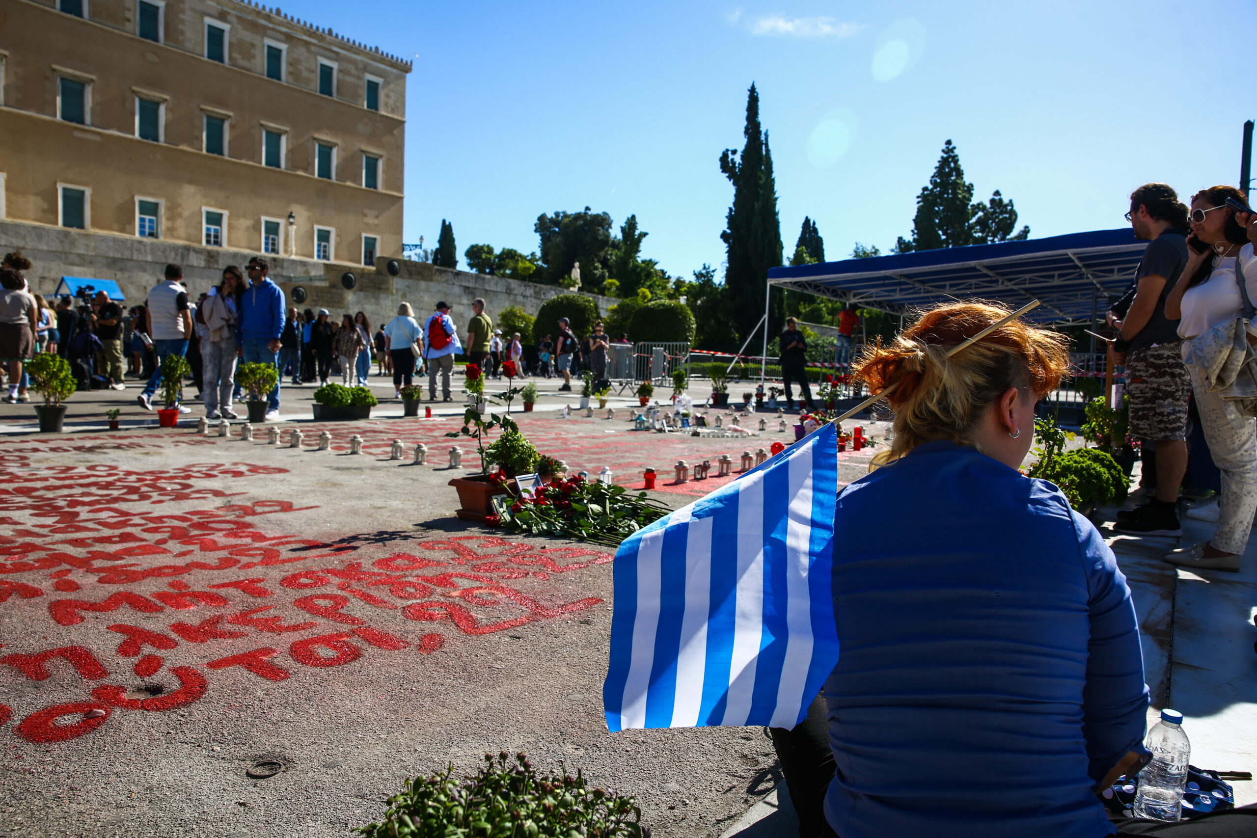 Λουλούδια στη μνήμη των θυμάτων των Τεμπών στο Σύνταγμα – Παρούσα και η Ζωή Κωνσταντοπούλου