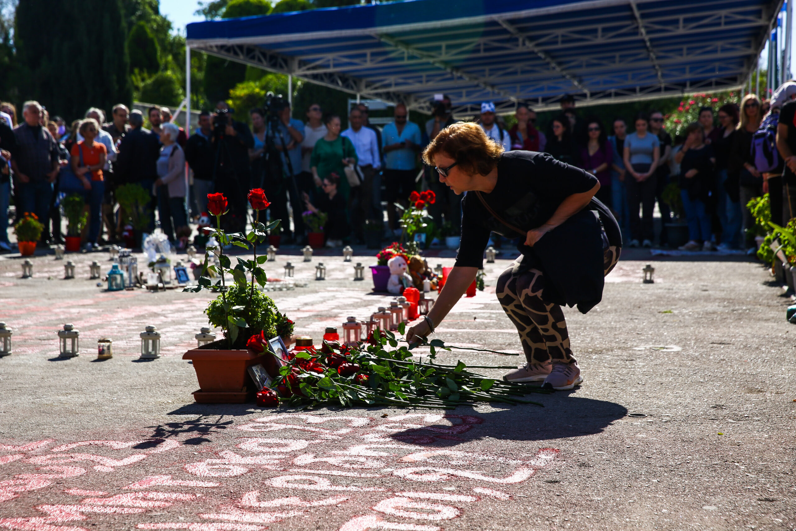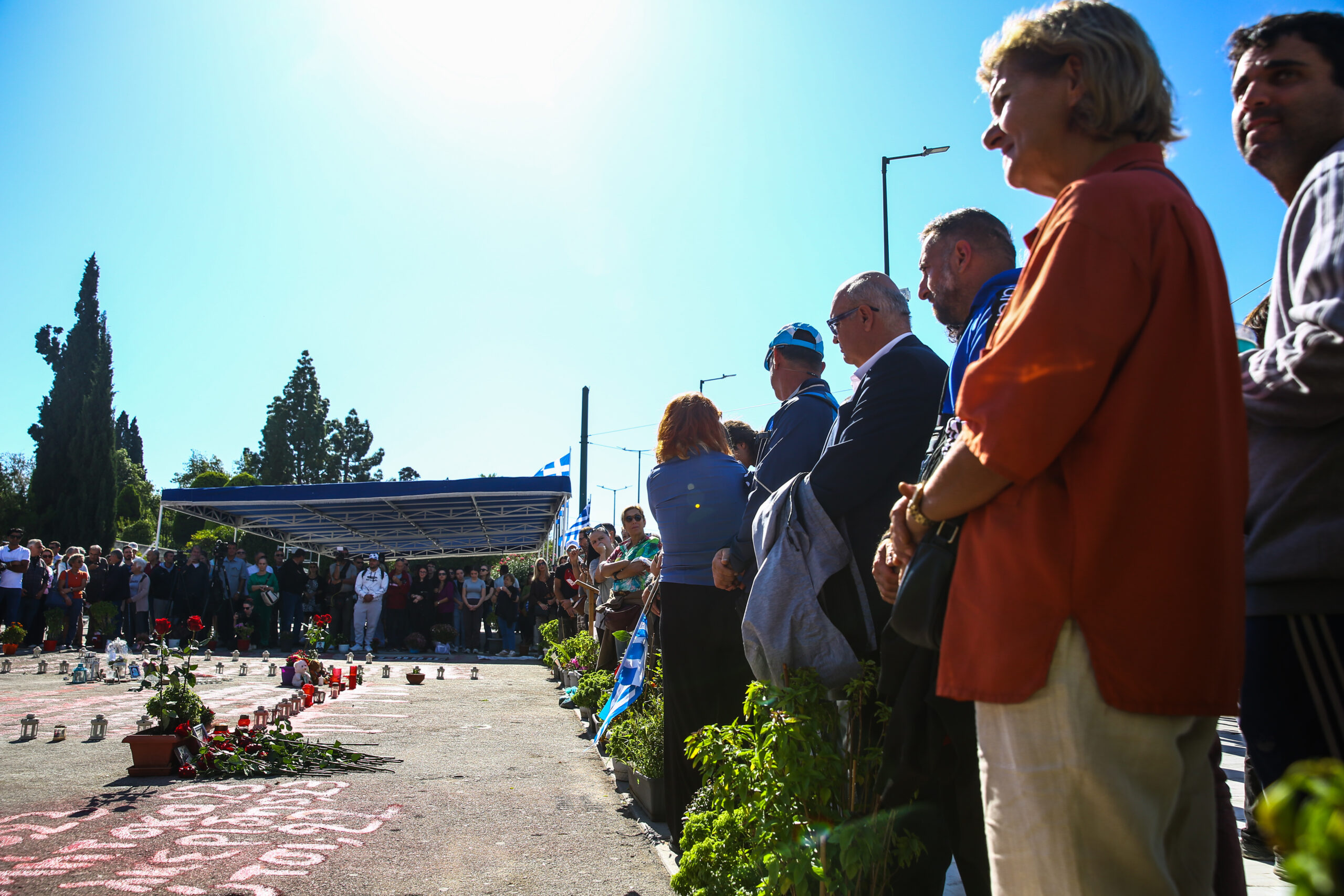 Μετά την ολοκλήρωση της μαθητικής παρέλασης στο Σύνταγμα, πολλοί πολίτες, μεταξύ των οποίων και συγγενείς θυμάτων του δυστυχήματος στα Τέμπη, κατευθύνθηκαν προς το άτυπο μνημείο μπροστά στη Βουλή, όπου είναι χαραγμένα τα ονόματα των θυμάτων της τραγωδίας.