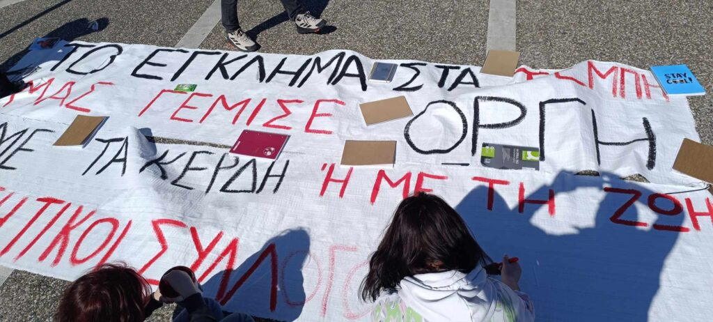 «Στέρεψαν τα δάκρυα και έγιναν οργή, η νέα γενιά δε σας συγχωρεί» έγραφε το πανό της Συντονιστικής Επιτροπής Μαθητών στην Πάτρα.