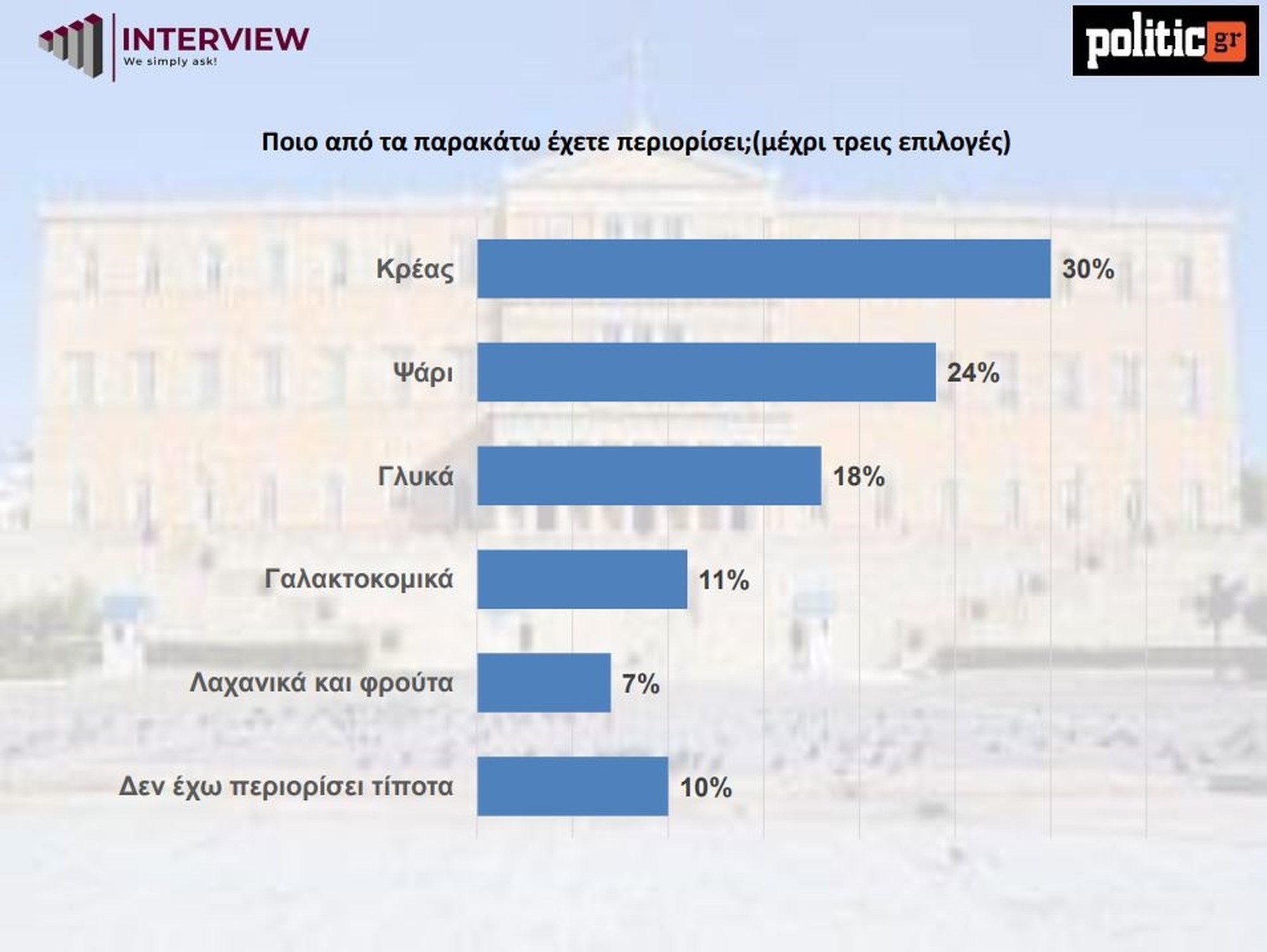 Μόλις 10% των ερωτηθέντων αναφέρει ότι δεν έχει περιορίσει κανένα είδος τρόφιμο.