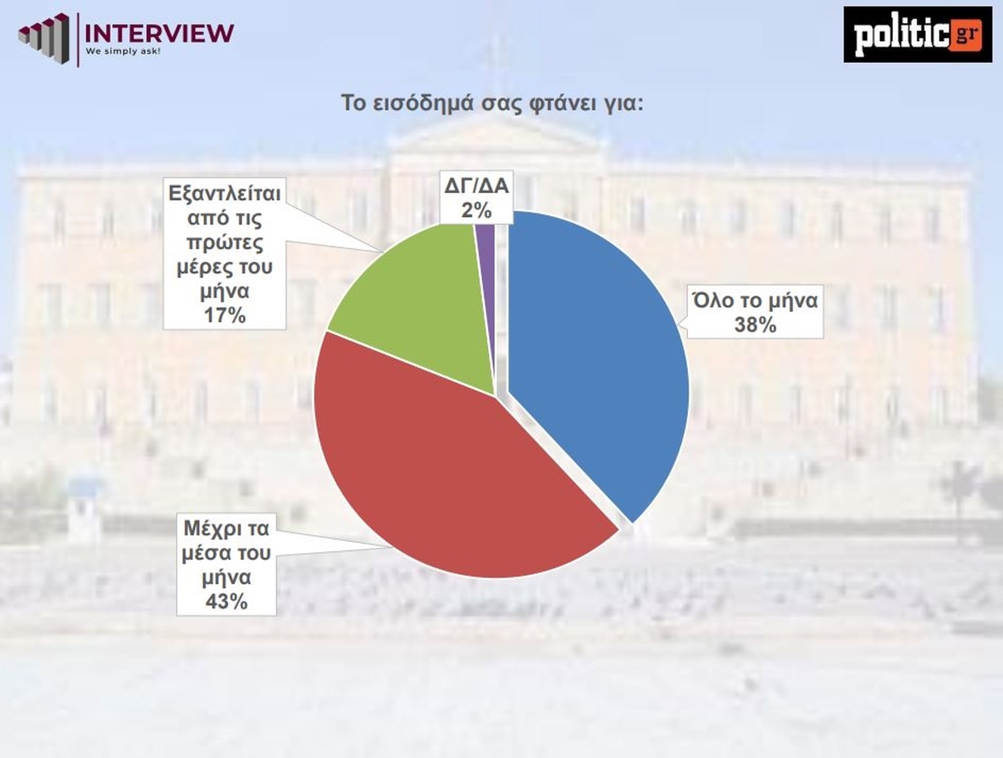 Η εικόνα επιβαρύνεται περαιτέρω όταν εξεταστεί η αυτοαξιολόγηση των πολιτών για την οικονομική τους κατάσταση. Το 43% δηλώνει ότι τα χρήματα φτάνουν μέχρι τα μέσα του μήνα, ενώ ένα 17% απαντά ότι εξαντλείται ήδη από τις πρώτες ημέρες. Μόνο το 38% αναφέρει ότι το εισόδημά του επαρκεί για ολόκληρο τον μήνα.