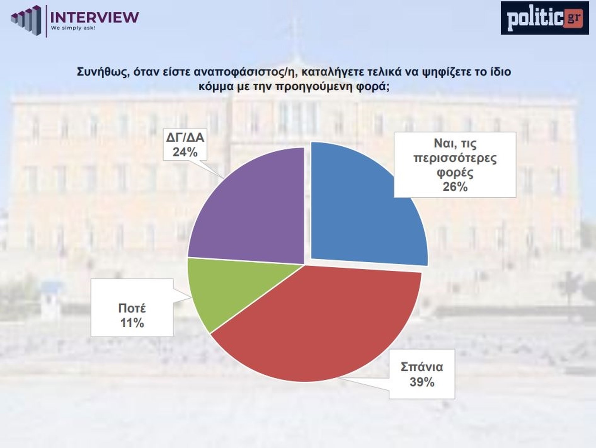 Η έρευνα δείχνει ότι ένα σημαντικό ποσοστό των αναποφάσιστων εμφανίζει τάση μετακινούμενης ψήφου, χωρίς σταθερή κομματική αναφορά. Το 39% δηλώνει ότι σπάνια επιστρέφει στο κόμμα που είχε επιλέξει στην προηγούμενη εκλογική αναμέτρηση, ενώ ένα 11% απαντά ότι δεν επιστρέφει ποτέ. Αντίθετα, το 26% αναφέρει ότι συνήθως καταλήγει στην ίδια επιλογή.