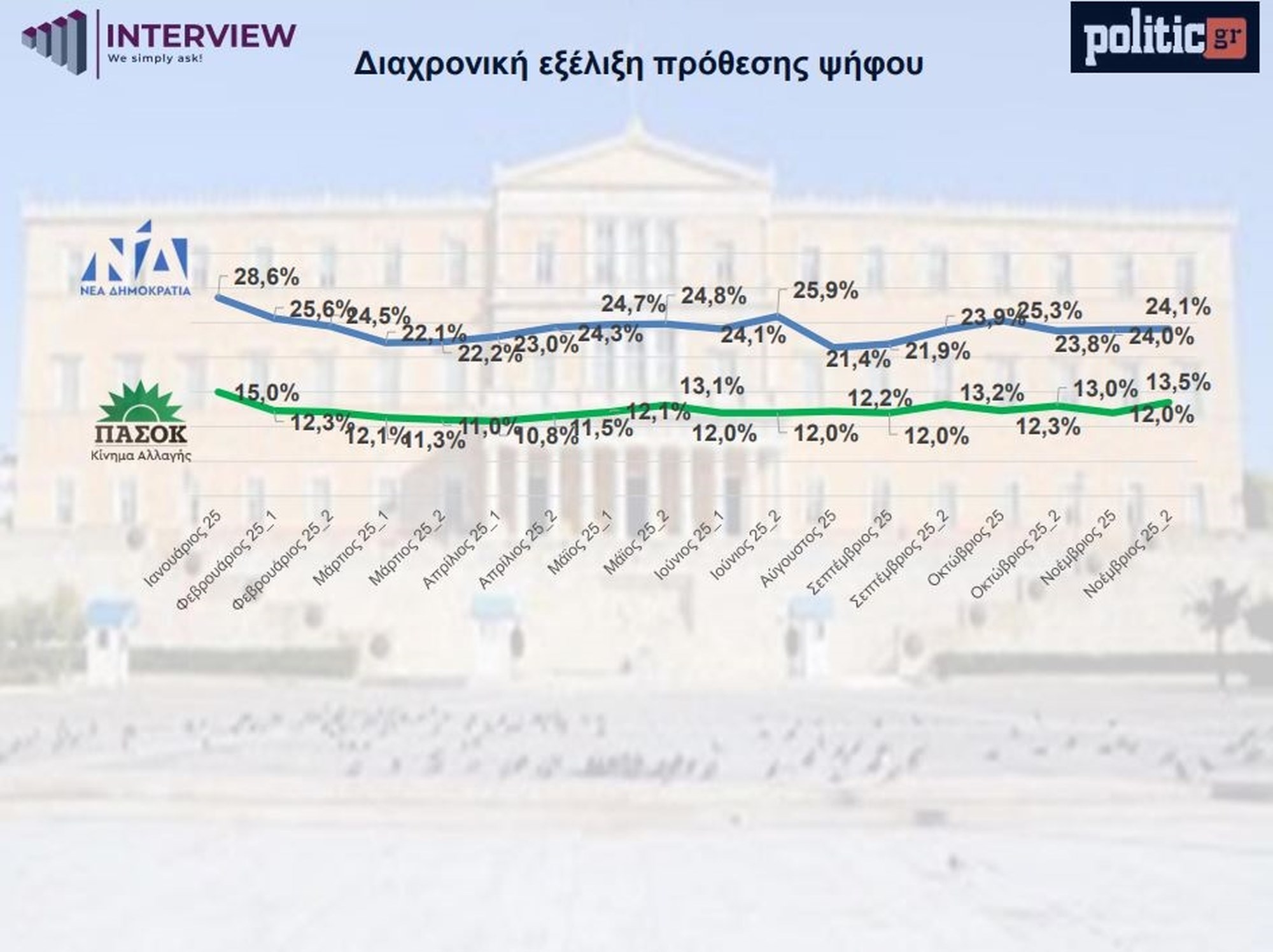 Σταθερές τάσεις μέσα στη χρονιά – Μεσοσταθμικά 25% για τη ΝΔ και 12,9% για το ΠΑΣΟΚ