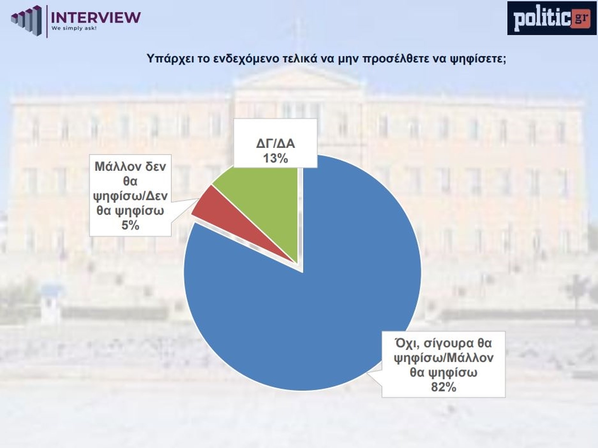 Παρά τη ρευστότητα, η συντριπτική πλειονότητα των αναποφάσιστων δηλώνει ότι θα προσέλθει στην κάλπη. Συγκεκριμένα, το 82% απαντά “σίγουρα” ή “μάλλον θα ψηφίσω”. Μόνο ένα 5% αναφέρει ότι “μάλλον δεν θα ψηφίσει” ή “δεν θα ψηφίσει”.
