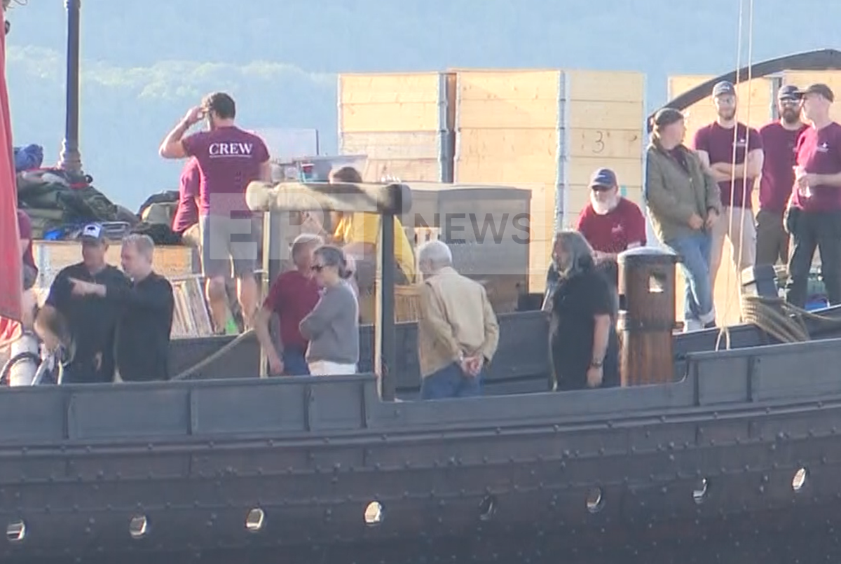 Οι δυο άνδρες έμειναν για αρκετή ώρα μέσα στη Νορβηγική «γαλέρα» που έχει καταπλεύσει εδώ και αρκετές ημέρες στο λιμάνι της περιοχής και επιθεώρησαν το άνοιγμα των πανιών και άλλες τεχνικές λεπτομέρειες στο πλοίο που θα αναπαριστά την πεντηκόντορο του πολυμήχανου Οδυσσέα, στην ταινία.