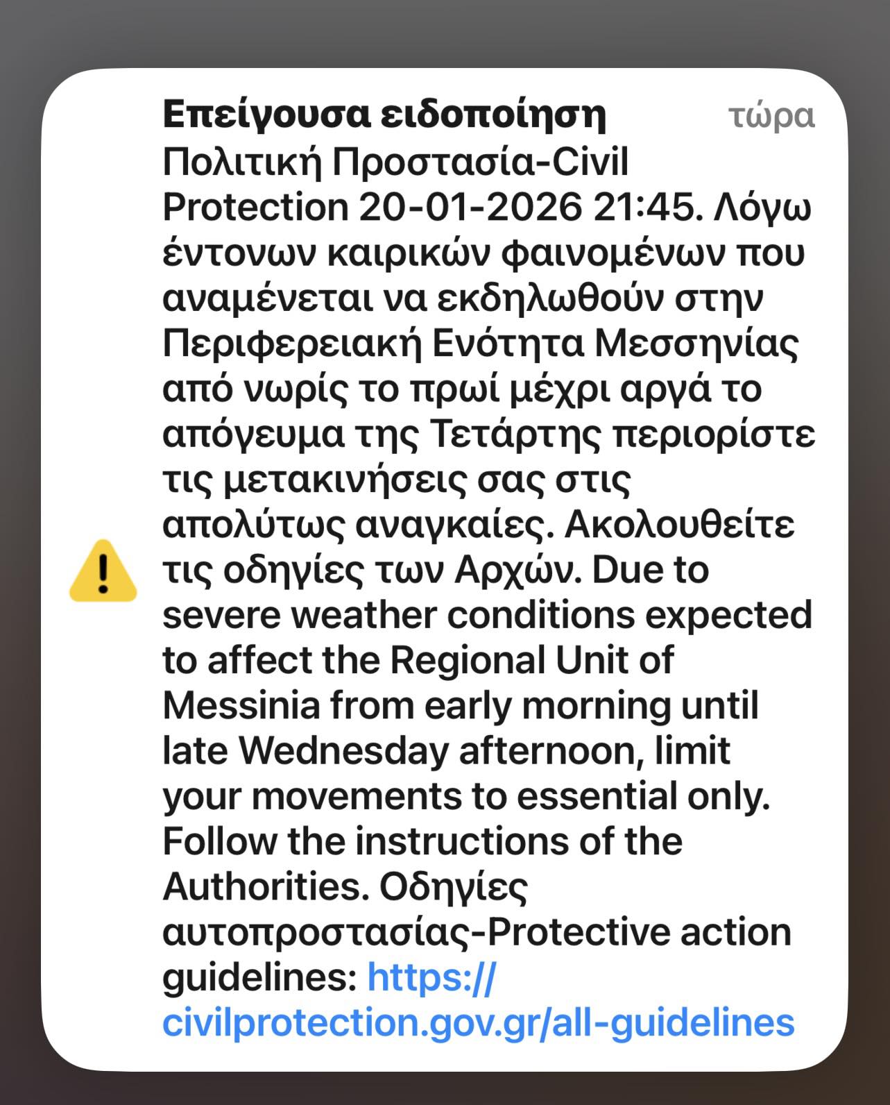 Συγκεκριμένα τα μηνύματα αναφέρουν: «Λόγω έντονων καιρικών φαινομένων που αναμένεται να εκδηλωθούν στις Περιφερειακές Ενότητες Μεσσηνίας, Αργολίδας, Λακωνίας, Αρκαδίας και της Κορινθίας από νωρίς το πρωί μέχρι αργά το απόγευμα της Τετάρτης περιορίστε τις μετακινήσεις σας στις απολύτως αναγκαίες. Ακολουθείτε τις οδηγίες των Αρχών».