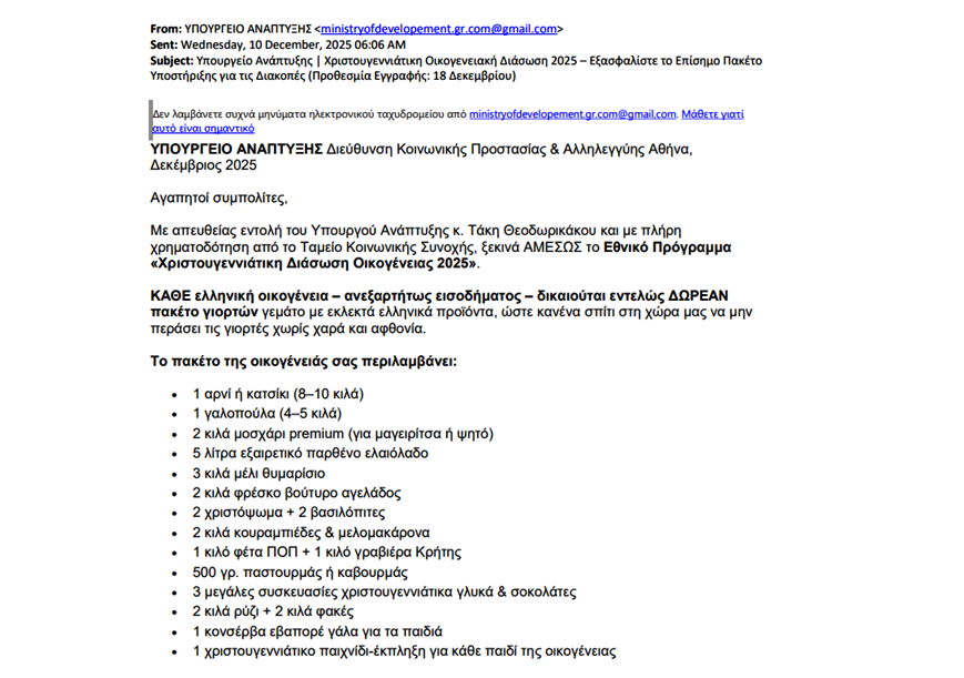 Ακόμη ένα παραπλανητικό e-mail εντοπίστηκε να διακινείται τις τελευταίες μέρες, αυτή τη φορά έχοντας τη μορφή δήθεν κρατικού προγράμματος που υπόσχεται δωρεάν γιορτινό πακέτο από το Υπουργείο Ανάπτυξης με τον τίτλο «Χριστουγεννιάτικη Διάσωση Οικογένειας 2025».